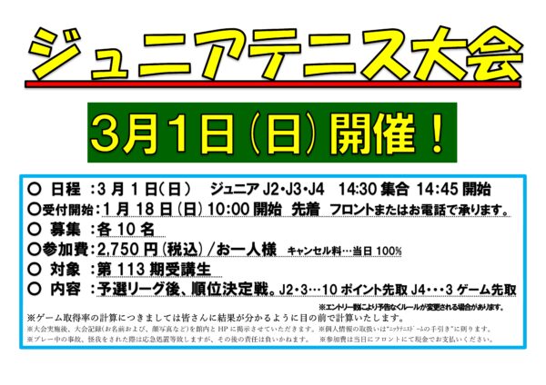イベント&新着情報 ピラティス体験会開催! 2026年01月27日 3月個別イベント一覧表 2026年01月27日 1/18(日)日進杯結果! 2026年01月19日 3/15(日)日進杯開催 2026年01月18日 3/1(日)ジュニアテニス大会開催! 2026年01月13日 3月1日に変更になりました。 2/8(日)テニトレ俱楽部開催! 2026年01月04日 2月個別イベント一覧表 2025年12月24日 12/14(日)オープンMIXダブルス結果報告 2025年12月15日 2/22オープン初級男子ダブルス開催! 2025年12月14日 11/30(日)ジュニアテニス大会結果 2025年12月02日 1 / 1112345...10...»最後 »