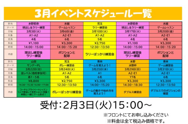 イベント&新着情報 ピラティス体験会開催! 2026年01月27日 1/9(金)・1/15(木)の体験会は実施済みです。 3月個別イベント一覧表 2026年01月27日 1/18(日)日進杯結果! 2026年01月19日 3/15(日)日進杯開催 2026年01月18日 3/8(日)ジュニアテニス大会開催! 2026年01月13日 2/8(日)テニトレ俱楽部開催! 2026年01月04日 2月個別イベント一覧表 2025年12月24日 2/22オープン初級男子ダブルス開催! 2025年12月14日 11/30(日)ジュニアテニス大会結果 2025年12月02日 1月個別イベント一覧表 2025年11月25日 1 / 512345»