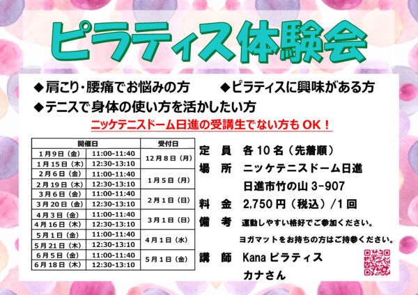 イベント&新着情報 ピラティス体験会開催! 2026年01月27日 3月個別イベント一覧表 2026年01月27日 1/18(日)日進杯結果! 2026年01月19日 3/15(日)日進杯開催 2026年01月18日 3/8(日)ジュニアテニス大会開催! 2026年01月13日 2/8(日)テニトレ俱楽部開催! 2026年01月04日 2月個別イベント一覧表 2025年12月24日 12/14(日)オープンMIXダブルス結果報告 2025年12月15日 2/22オープン初級男子ダブルス開催! 2025年12月14日 11/30(日)ジュニアテニス大会結果 2025年12月02日 1 / 1112345...10...»最後 »