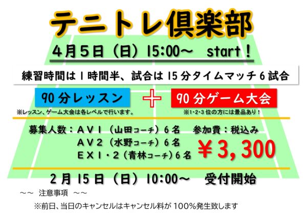 4/5(日)テニトレ俱楽部開催!