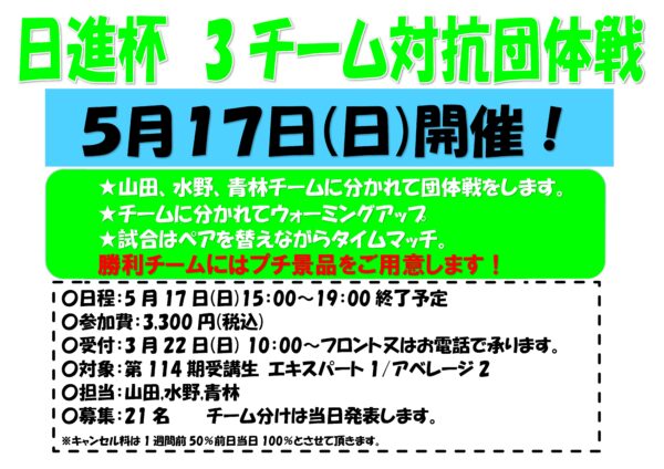 イベント&新着情報 5/17(日)日進杯開催! 2026年03月16日 今回よりキャンセル料に変更がありますのでご確認ください。 やむを得ないご予定や体調不良に関してはご相談ください。 « 2/22(日)オープン初級男子ダブルス結果 3/15(日)日進杯結果! »